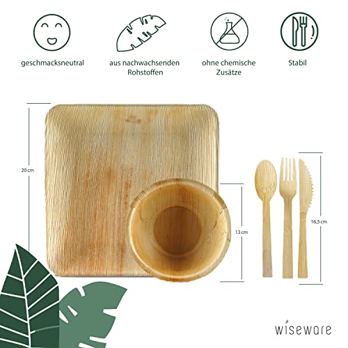 wiseware Palmblatt Geschirrset 25 Palmblattteller & Schalen, 25 Messer, Gabel & Löffel – Einweggeschirrset aus Palmblatt und Bambus als Alternative zu Papier & Plastik biologisch abbaubar, 125 Stück